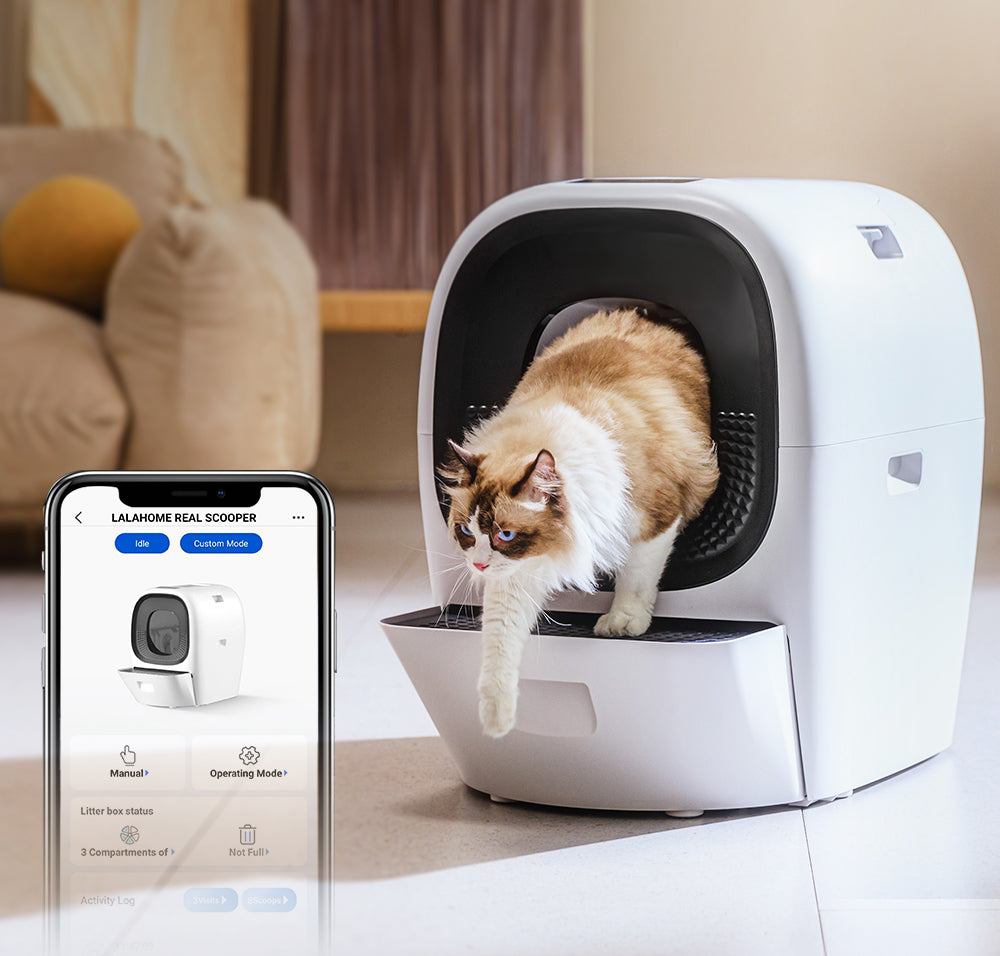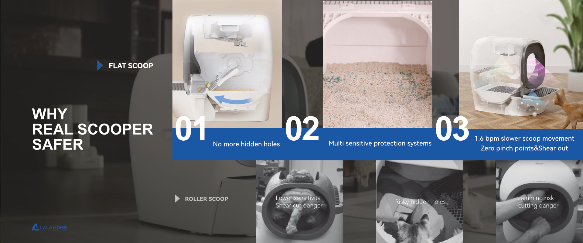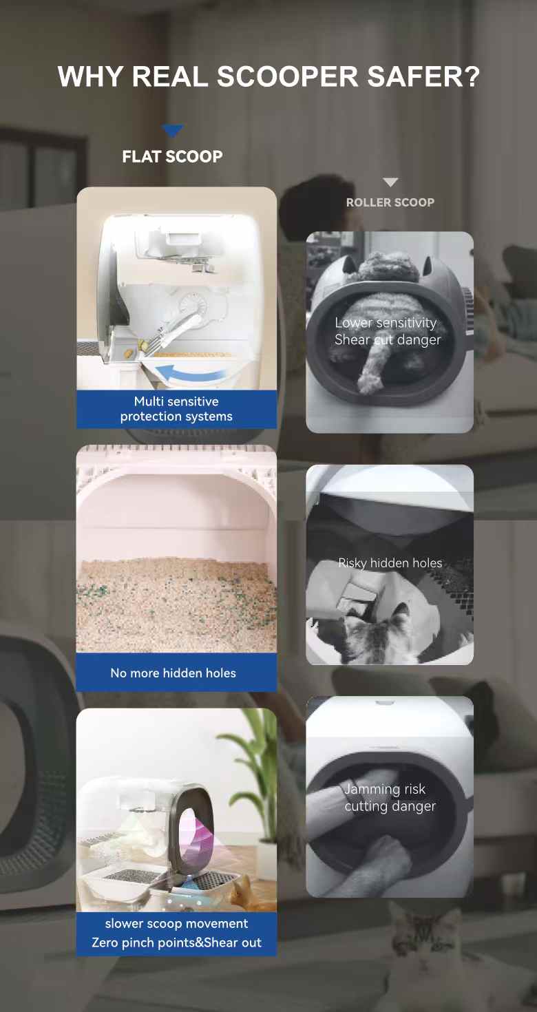 Imitating human scooping, allowing the full litter bed to be cleaned. Self-cleaning after litter well clumped. Cats are always in good hands.