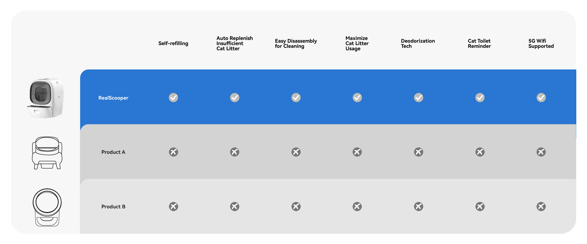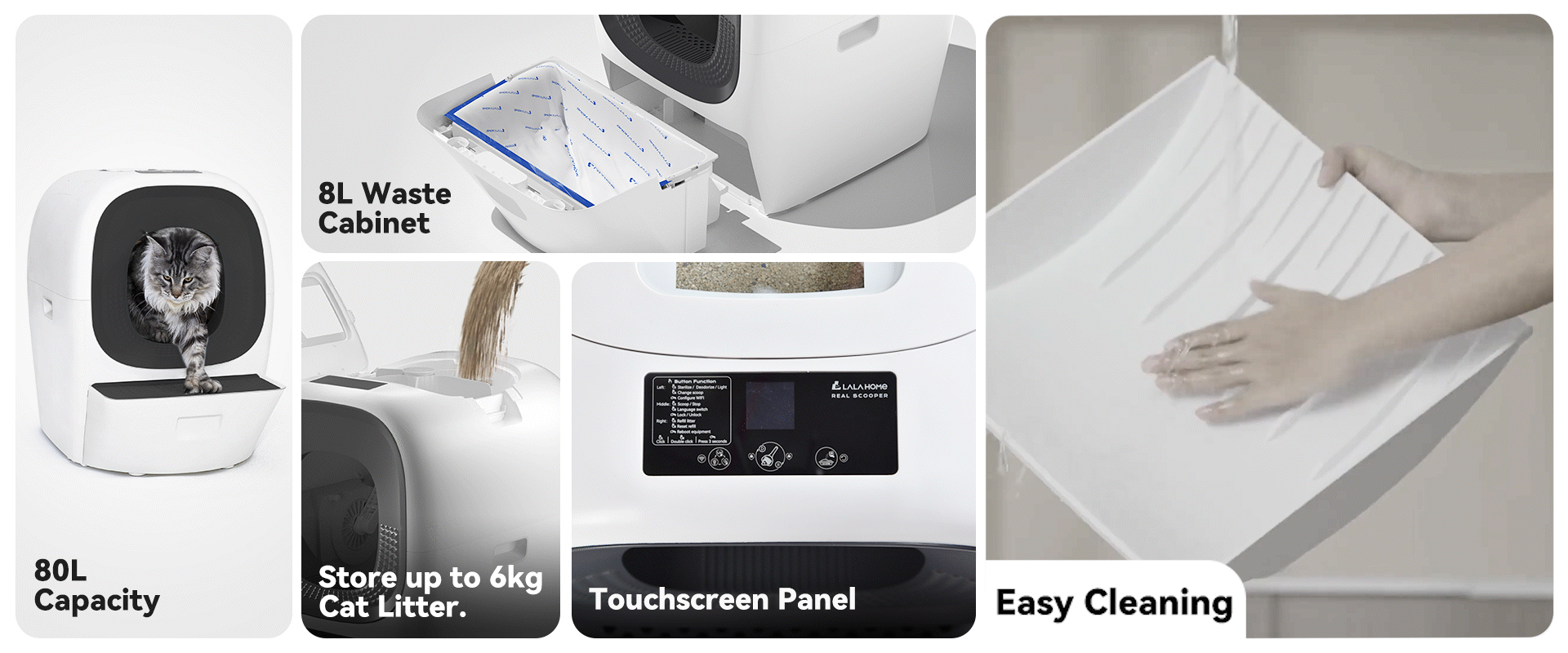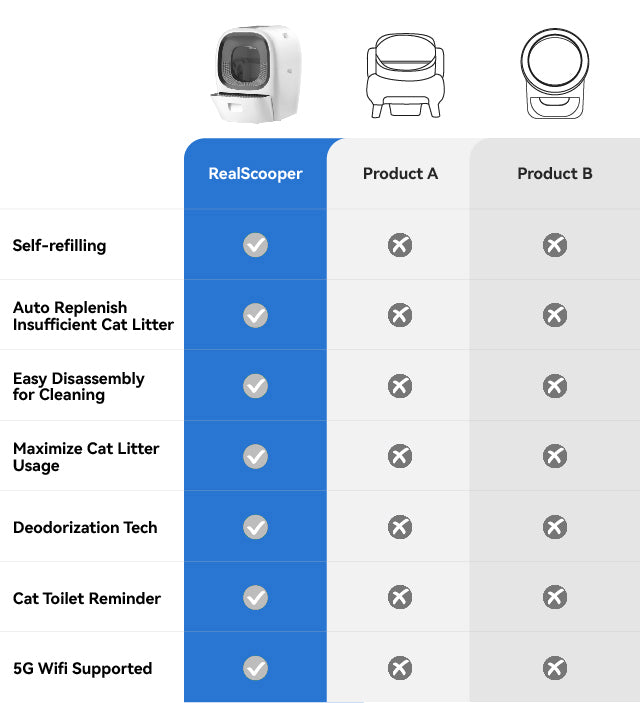 The RealScooper’s advanced deodorization system and auto-filling baffle cut down 70%-80% of odors. Plus, UVC sterilization wipes out harmful bacteria, ensuring a pristine, healthy environment for your cats.